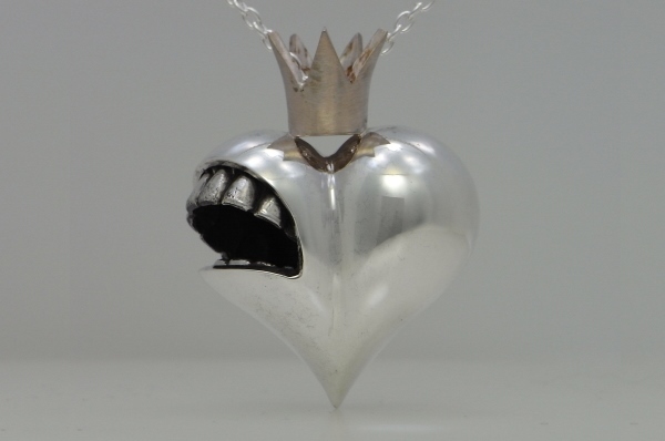| 高円寺「アリスと豆の木」で行われた『NewYearALICE2013』に出品した作品。 -Off with your head!- 二言目にはそう叫ぶハートの女王様も、今では首だけ。 今ではなんて言うだろう。 王冠にはピンクシルバーを使用しています。 銅成分が多いのですぐに硫化して変色する金属ですが、女王の威厳の移り変わりとしてお楽しみください。 【注意】 こちらはペンダントトップのみの販売です。 画像のチェーンは説明文のリンク先で販売しています。 こちらのチェーンは【siver925アズキチェーン4】幅2.8mm 長さ70cmです。 チェーン販売ページ https://sm-silver.com/ch_sv925azuki_normal_1.htm |