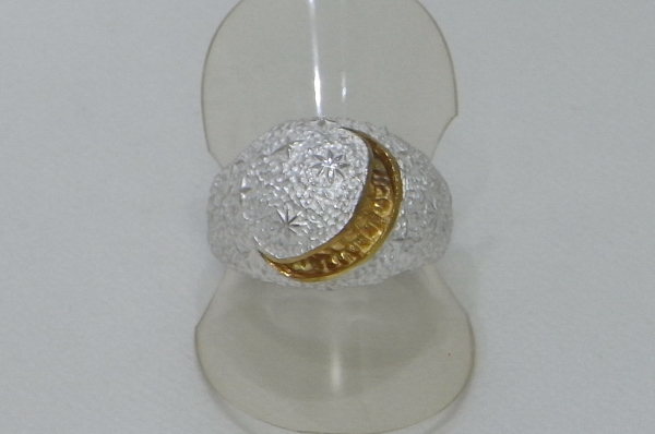 三日月って笑ってるみたいだよねと思って創った三日月スマイルリング 白仕上げVer.です。 三日月と歯の部分にはK18コーティングを施して、より月らしくしています。 白仕上げやK18コーティングは、使っていくうちに当たる部分は銀色になっていきます。 |